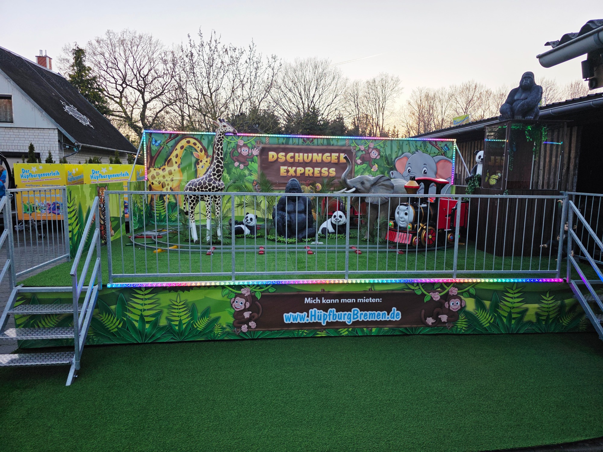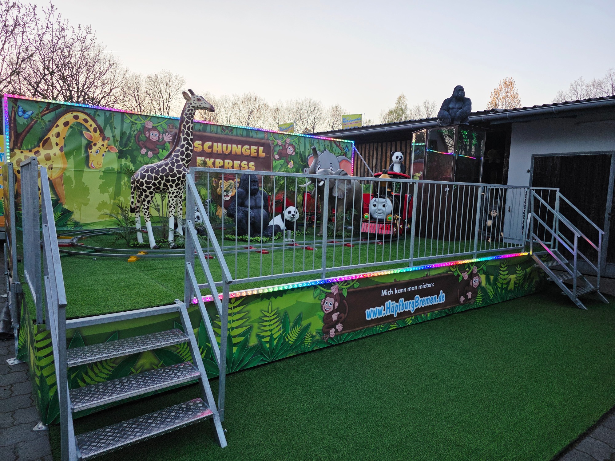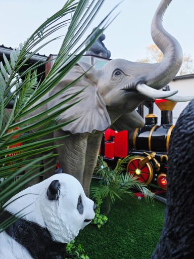 Diese Bahn ist einmalig in Größe und Aufmachung in der Region und begeistert Kinder sofort mit ihrem liebevoll gestalteten Dschungel-Design, den detailreichen Waggons und den modernen LED-Lichteffekten sowie den lebensgroßen Dschungel Figuren, dadurch ist die Bahn auch ein absoluter Blickfang und Anziehungspunkt auf Ihrer Veranstaltung.